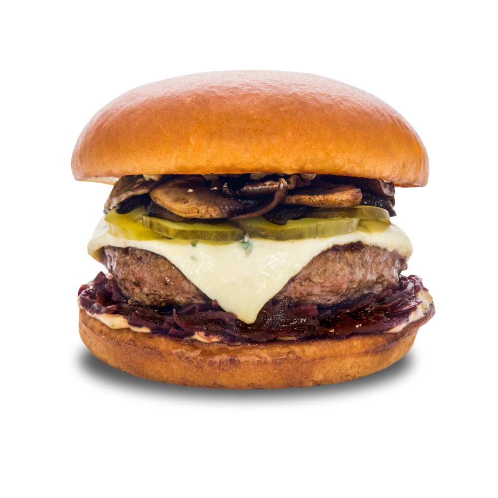 Ingrediente: carne vita Black Angus, Blue Cheese, ciuperci champignon, castraveti murati, gem ceapa rosie, sos Mo’s, chifla burger