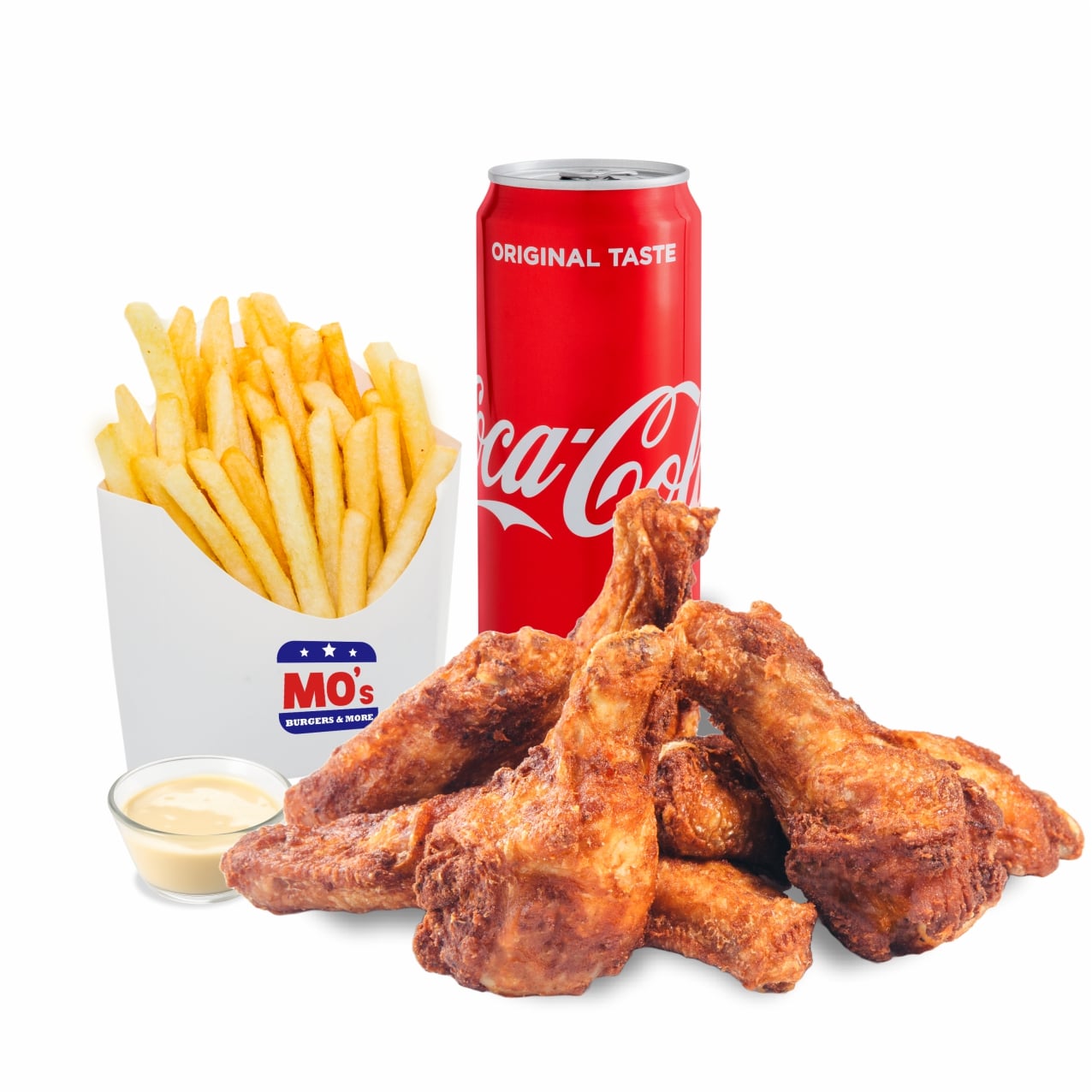 360 – 390 g Ingrediente: 10 aripioare de pui 220 g + sos inclus la alegere (20 – 40 g) + cartofi prajiti 120 g + suc doza sau apa (330 / 500 ml)