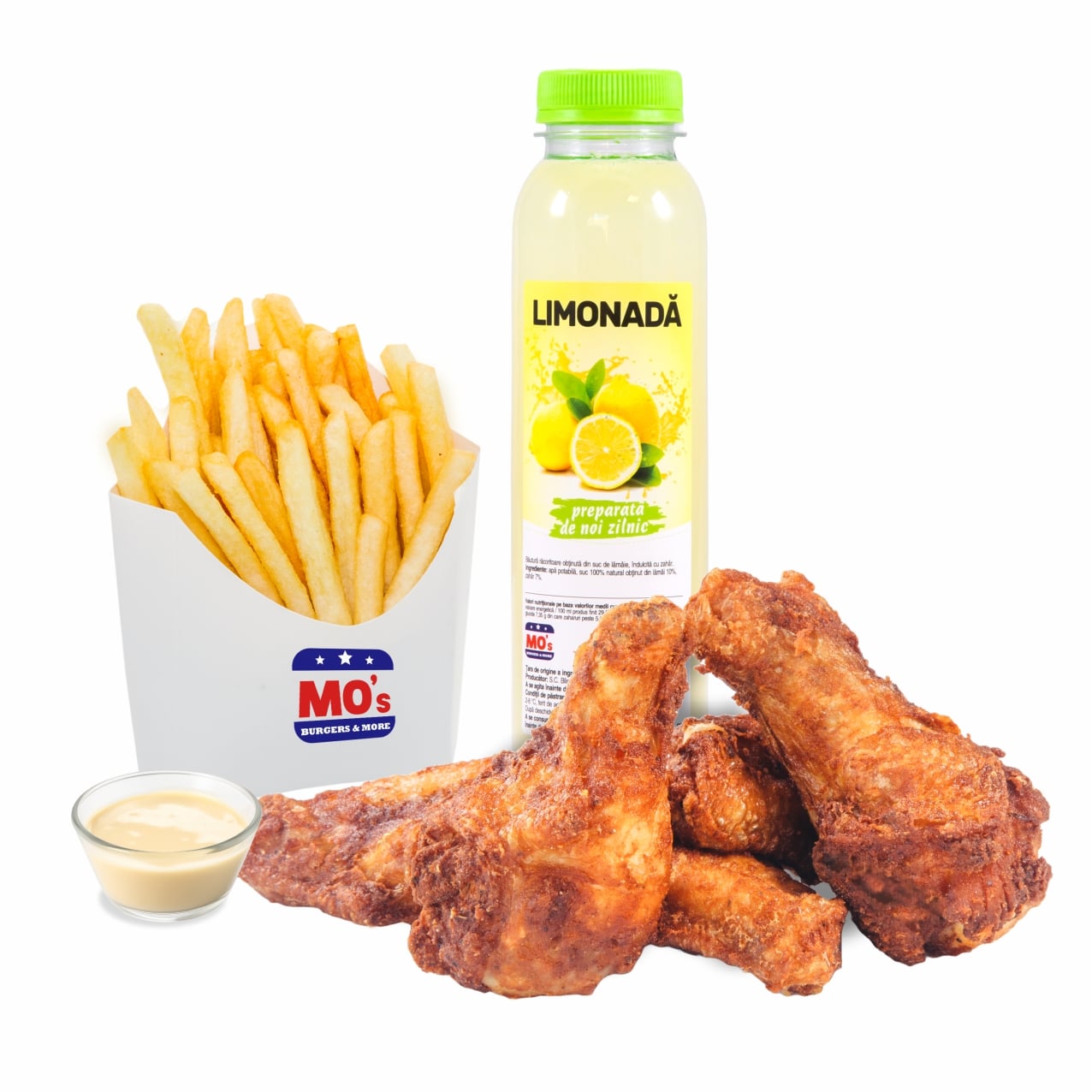 310 – 330 g Ingrediente: 7 aripioare de pui 170 g + sos inclus la alegere (20 – 40 g) + cartofi prajiti 120 g + limonada / socata (400 ml)