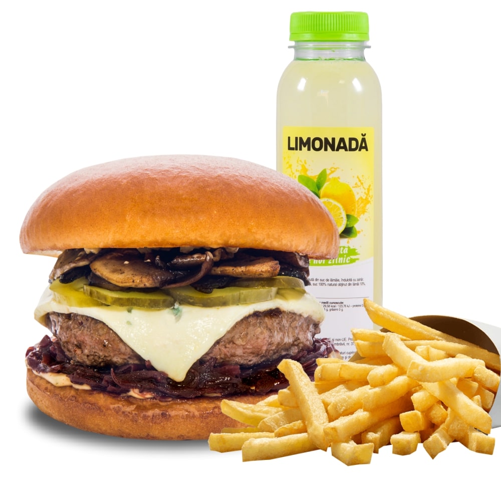 430 g Ingrediente: Big Mo Burger 310 g + cartofi prajiti 120 g + limonada / socata (400 ml)