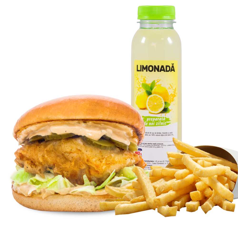 420 g Ingrediente: Chicken Burger 300 g + cartofi prajiti 120 g + limonada / socata (400 ml)