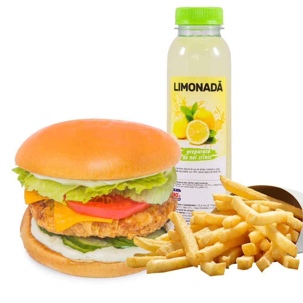 420 g Ingrediente: Chicken Fresh Burger 300 g + cartofi prajiti 120 g + limonada / socata (400 ml)