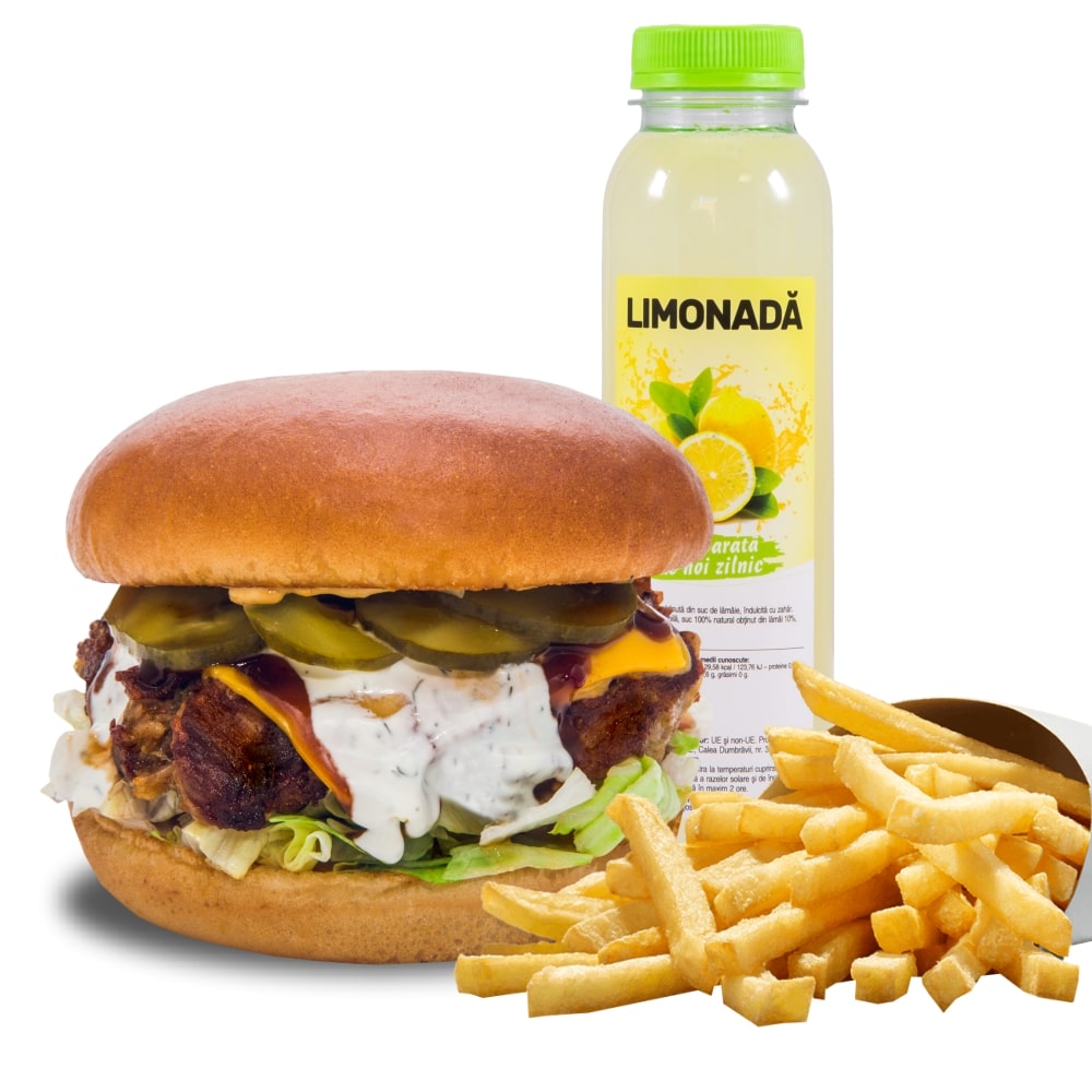 400 g Ingrediente: Meaty Mo Burger 280 g + cartofi prajiti 120 g + suc sau apa (330 / 500 ml)